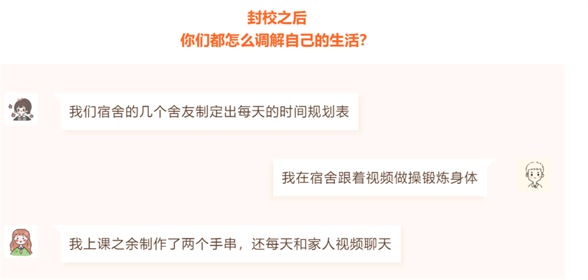 王淑莲表示,去年疫情防控期间学生们居家在线教学,反映的问题普遍是如何更好地应对孤独和家庭关系。在此次疫情防控期间学生们在学校封闭式管理,活动空间受限,反映的也多是如何更好的处理好线上教学和生活的关系、舍友之间的关系等等。