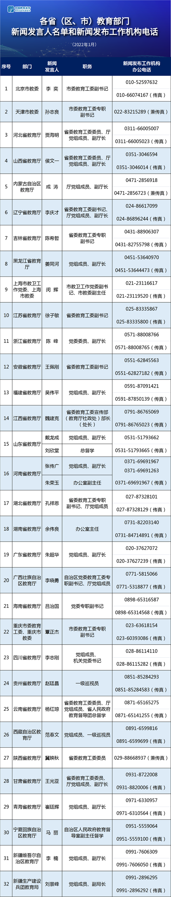 1月10日,教育部公布各省(区、市)教育部门、教育部直属高校及部省合建高校新闻发言人名单和新闻发布工作机构电话。跟教育小微一起看——