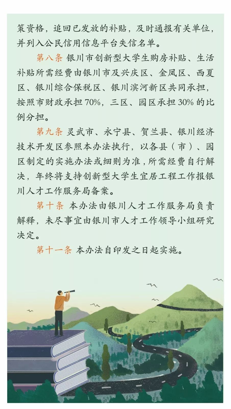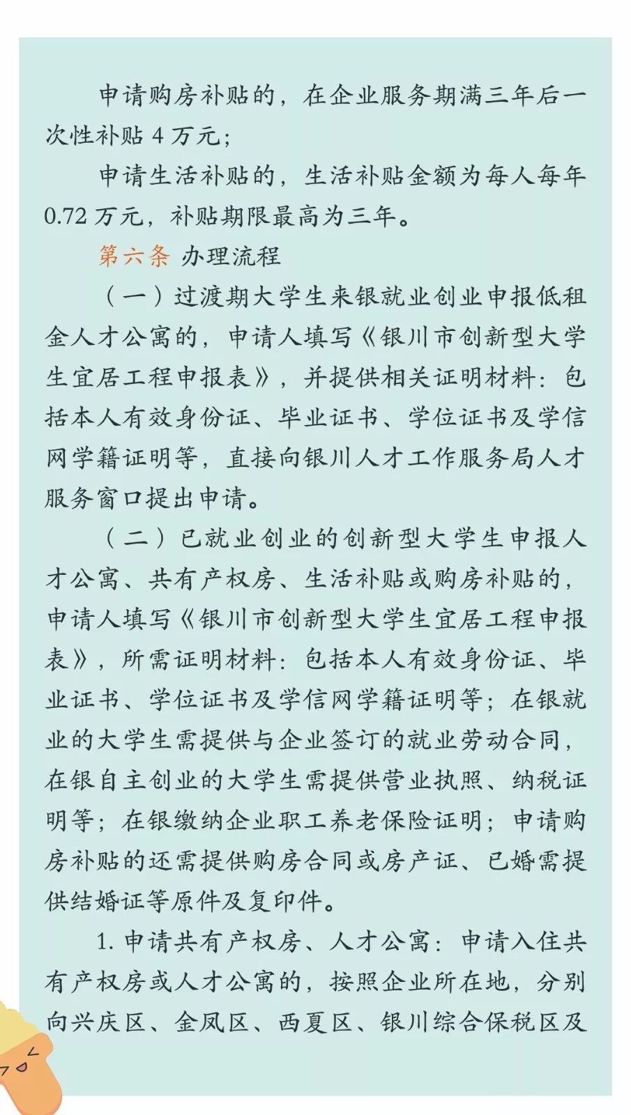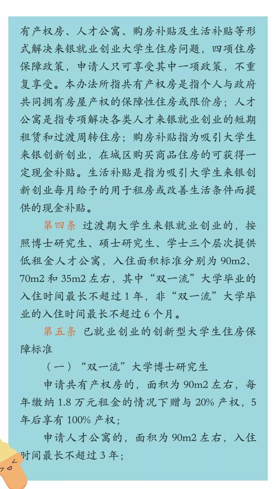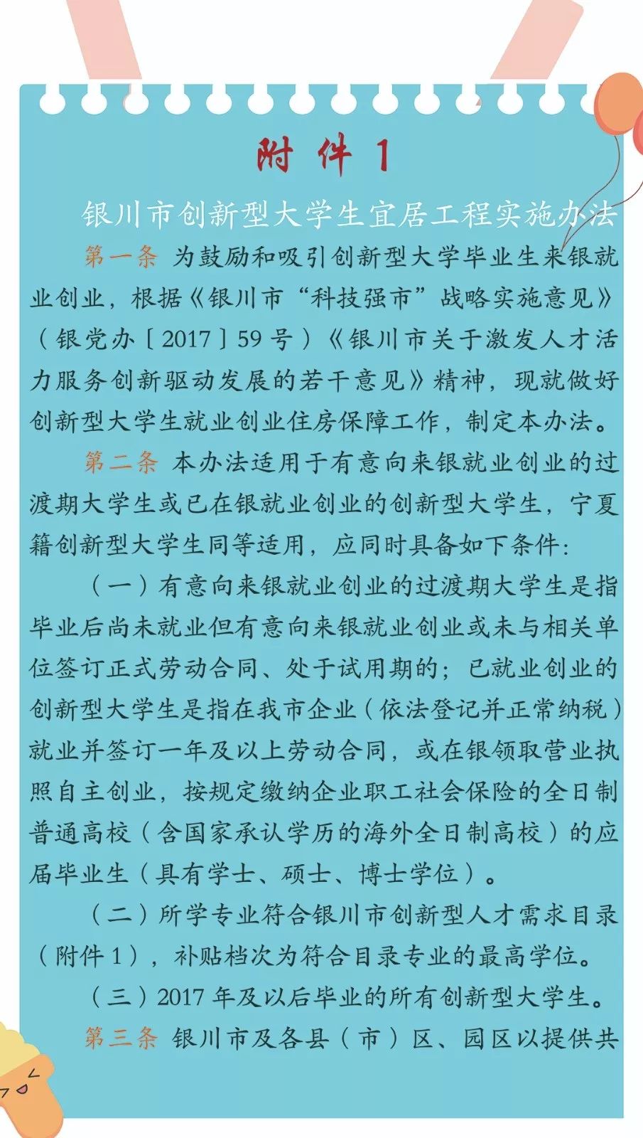 为吸引更多符合银川市重点产业发展需求的高校毕业生来银就业创业,银川市近年来相继配套出台了《银川市创新型大学生宜居工程实施办法》《银川市创新型大学生共有产权房管理办法(试行)》等政策,通过共有产权房、人才公寓、购房补贴、租房补贴4种方式,按照博士、硕士、学士3个层次,“双一流”“非双一流”2个类别,共6个档次,对已在企业就业或自主创业的全日制应届普通高校毕业生最高提供每年2.4万元的生活补贴、12万元的购房补贴、90平方米的人才公寓或共有产权房“四选一”的住房保障措施,解决创新型大学生在银安居安家问题。