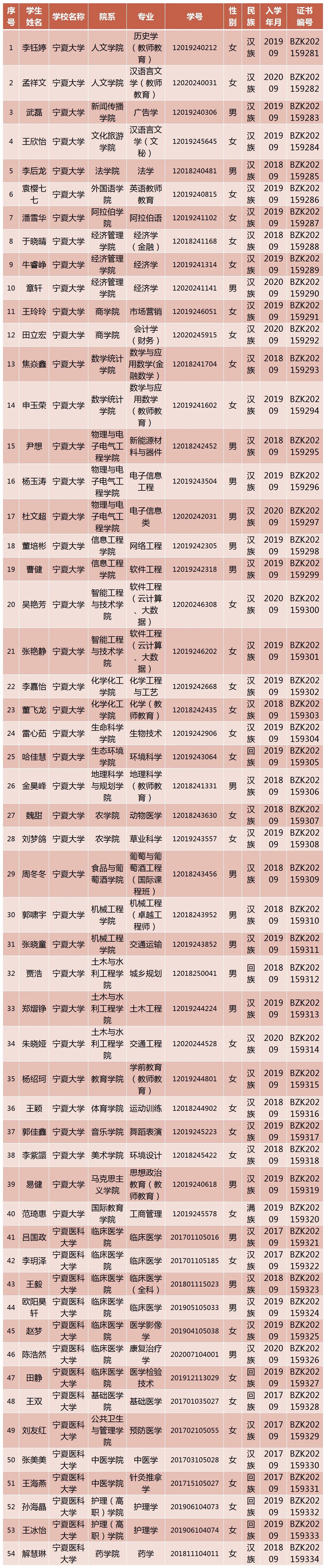 宁夏高校学生获奖名单